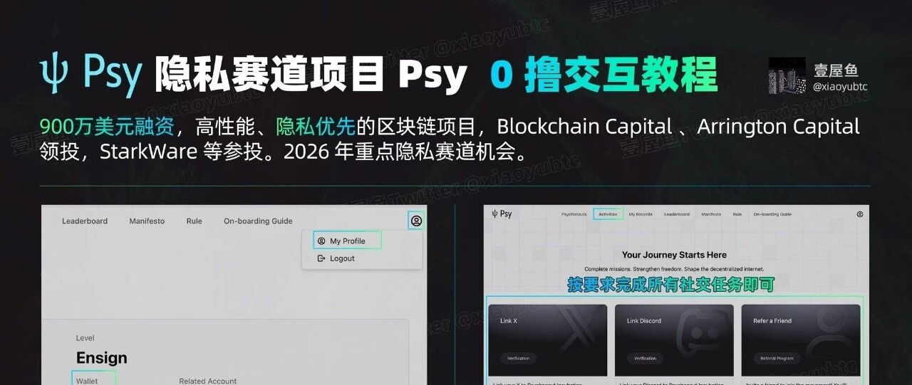 本文介绍隐私公链Psy Protocol的交互教程,项目基于PoW 2.0共识,已完成900万美元融资。用户可通过邮箱或Google账号登录,完成每日签到、Twitter和Discord社交任务及邀请任务获取积分,积分未来有望兑换代币。文中强调使用官方入口、注意安全并提示空投规则...