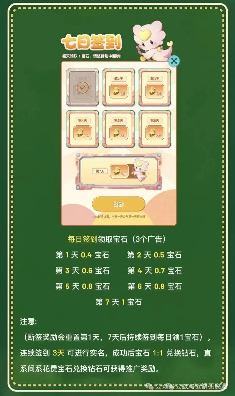 首日可得 0.4 宝石,随后每日递增,至第 7 日达 1 宝石 。若断签,奖励重置;连续签到 3 天可实名,实名后宝石可 1:1 兑换钻石,直系用户兑换还可获推广奖励,7 日后持续签到每日领 1 宝石 。