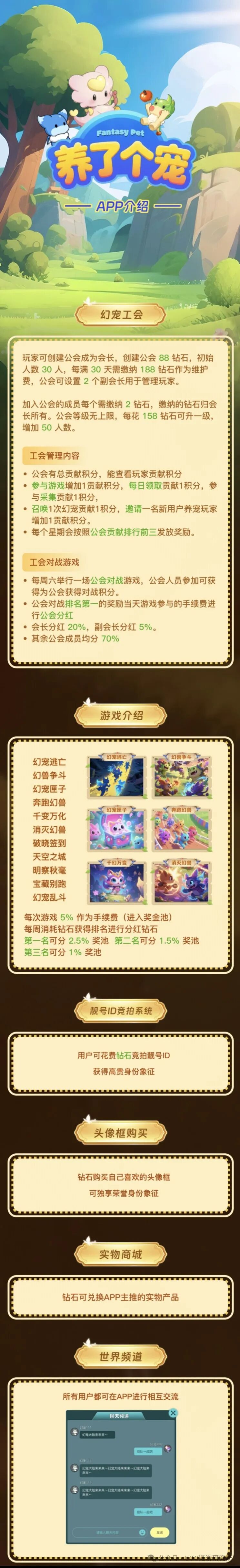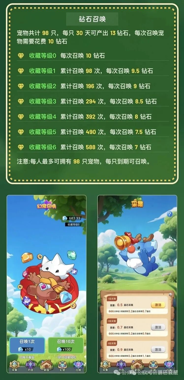 一共 98 只宠物,每只 30 天可产出 13 钻石 。初始召唤需 10 钻石/次,随收藏等级提升,召唤花费渐减,最低至 7 钻石/次 。每人至多拥有 98 只,到期可召唤 。