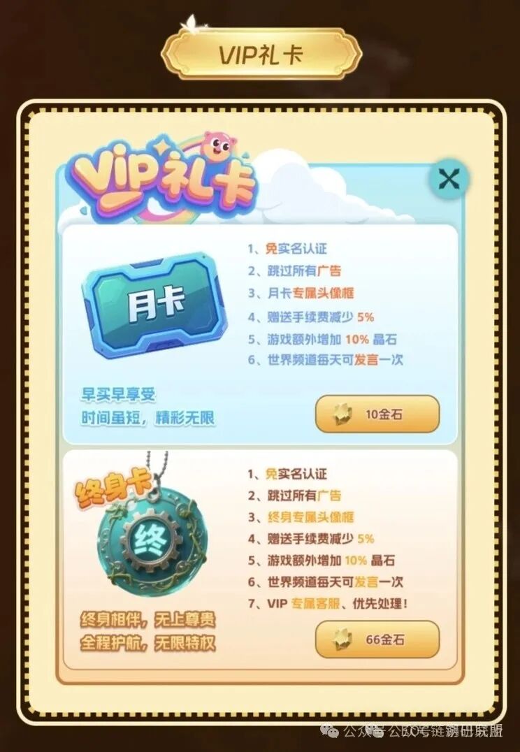 终身卡:售价 66 钻石,享免实名认证、跳所有广告、赠专属头像框、手续费减 5%、游戏晶石增 10%、每日世界频道发言 1 次、专属客服优先处理