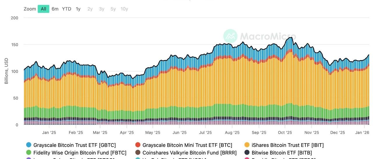 截至目前,比特币 ETF 总管理规模(AUM)已攀升至 1248.5 亿美元。其中头部效应极为显著:IBIT(741.1 亿美元)、GBTC(164 亿美元)、FBTC(188.9 亿美元)、ARKB(58.1 亿美元)与 BITB(53.5 亿美元)这五只产品,合计管理资产达 1205.6 亿美元,占整体市场的 96.6%,清晰勾勒出机构主导的市场格局。