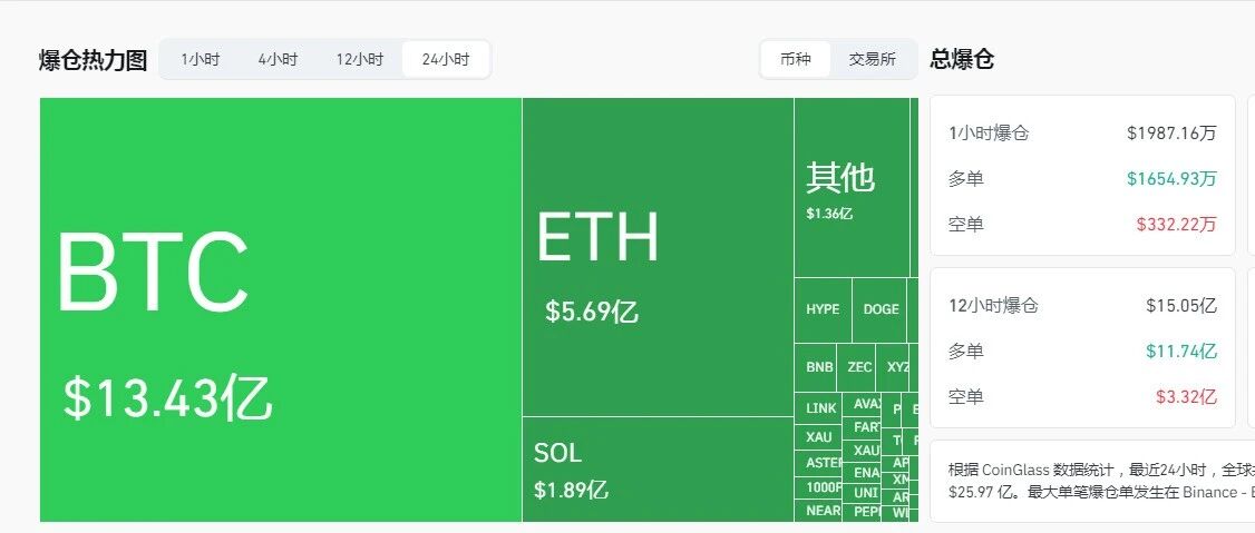 Coinglass数据显示,过去24小时全网爆仓25.97亿美元,其中多单爆仓21.29亿美元,空单爆仓4.68亿美元,主爆多单。BTC爆仓13.43亿美元,ETH爆仓5.69亿美元,SOL爆仓1.89亿美元。全网超过57.7万人被爆仓,最大单笔爆仓单发生在 Binance - BTCUSDT,价值1202.09万美元。